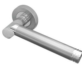 Octavia designer lever on rose door handle is available in a dual Polished Chrome / Satin Chrome Finish. Includes bolt through fixings concealed under screw on rose and secured with grub screw fixings into splined spindle.