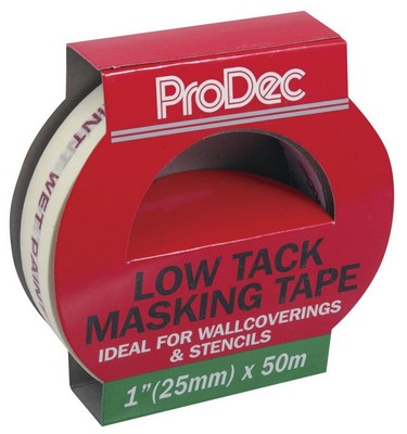Prodec Low Tack Masking Tape A low tack - low residue - masking tape for delicate surfaces. Ideal for use on previously painted surfaces where low tape adhesion and minimum surface damage is required. Ideal for duo-toning and stencil work.