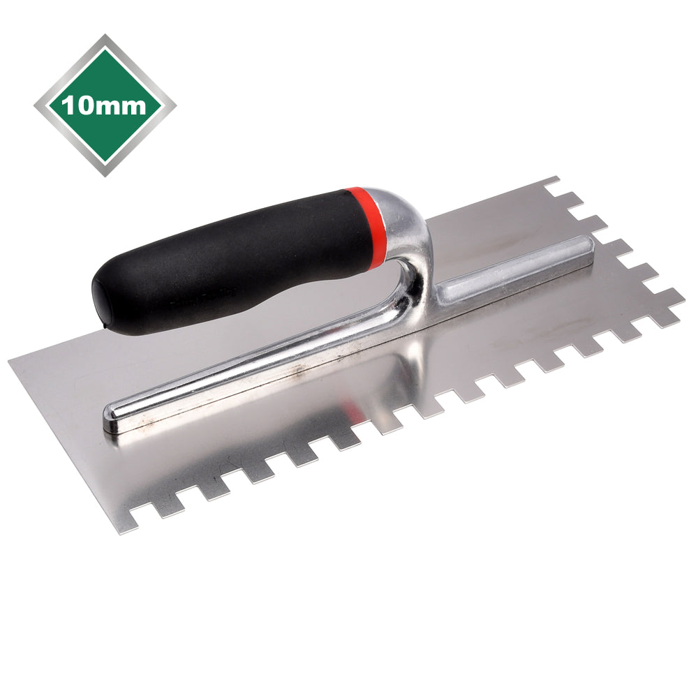 Tile Rite square notched trowels are used for laying down tile adhesive ready for tiling. The Stainless Steel blade is rust and corrosion resistant offering tilers a reliable and durable option. Cast aluminium handle is 6 spot rivet mounted and finished with a U curved comfort grip.